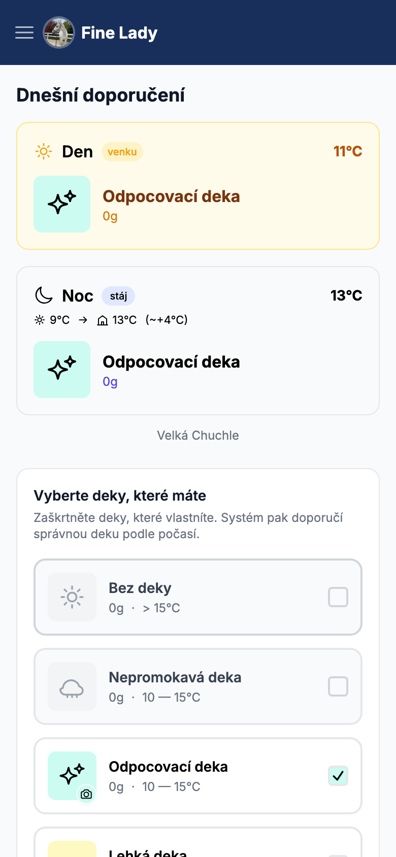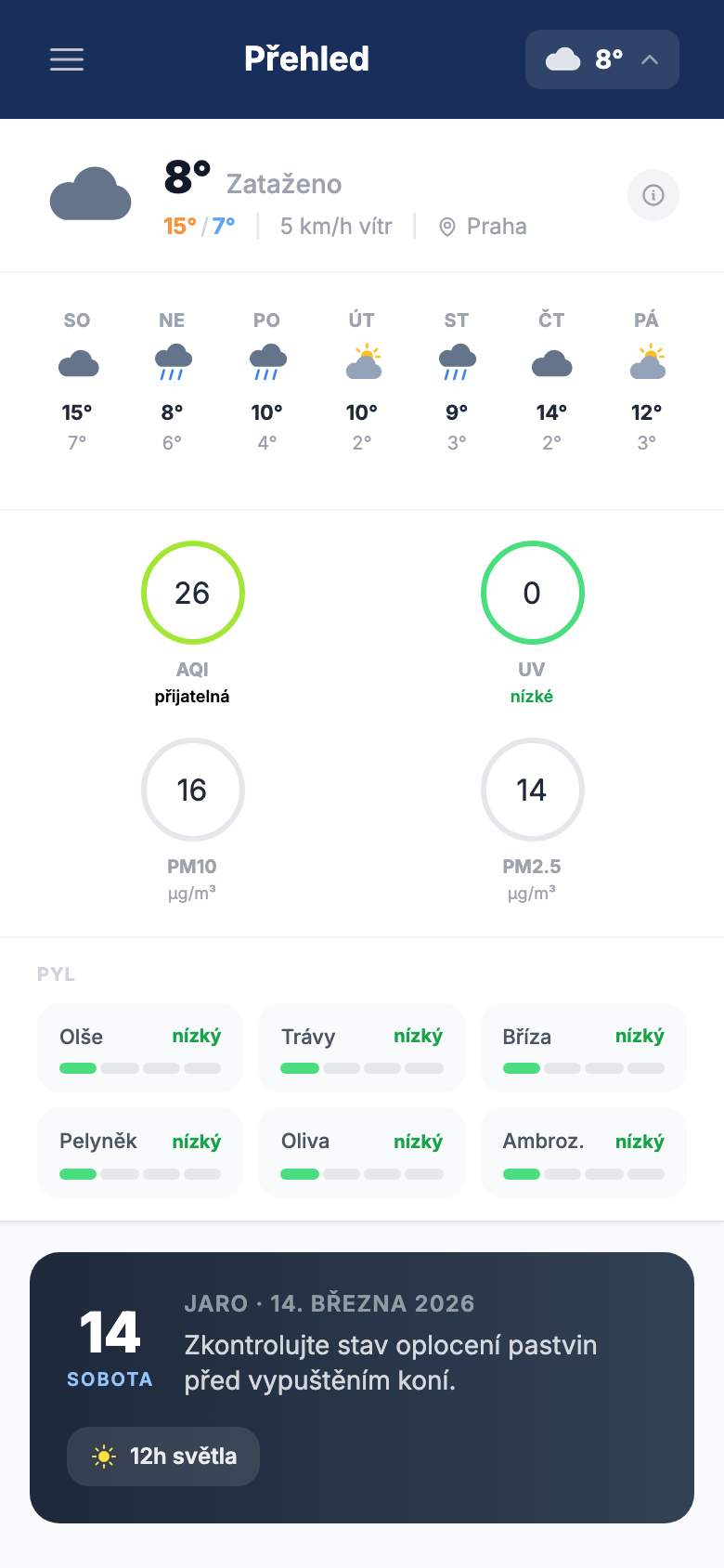 Aktuální předpověď přímo na dashboardu, propojená s doporučením dek.